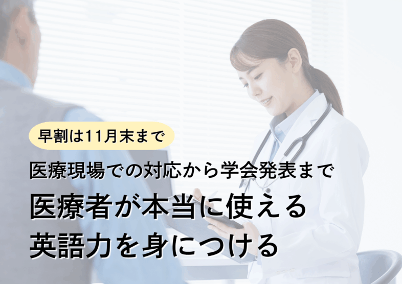 日本における医療分野でもグローバル化が加速しています。日本に滞在する外国人患者の問診、治療などをはじめ、臨床留学、国際学会での発表など、さまざまなシーンで英語力が求められています。また、英語ができることで得られるチャンスやひろがる選択肢が増えるのも事実です。