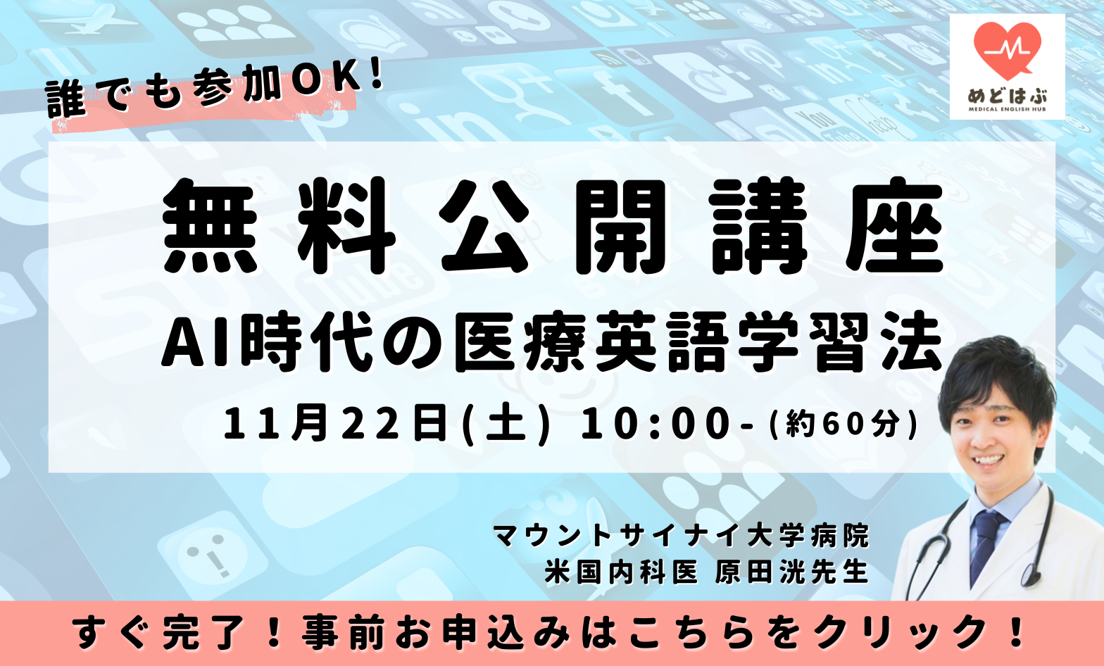 11月22日(土)10:00より、アメリカ在住の米国内科医の原田洸先生による無料公開講座を開催が決定しましたのでお知らせです。